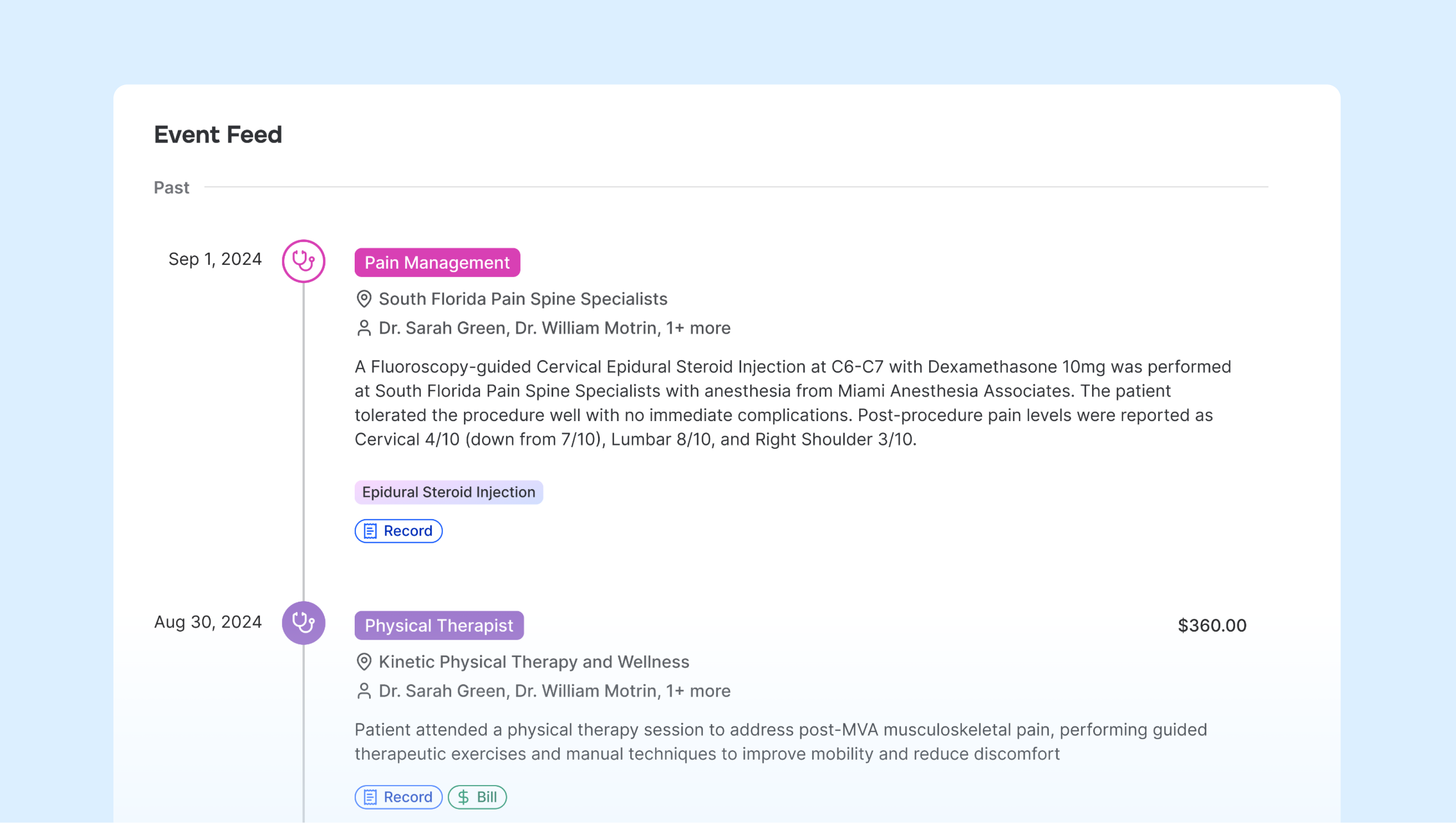 An interactive timeline of each client’s treatment history, upcoming care, medical expenses, notes, and plaintiff communications, all within an hour of file upload.