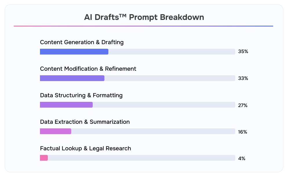 Prompts for drafting and generating legal documents and communications make up 35% of total AI Drafts™ prompts.