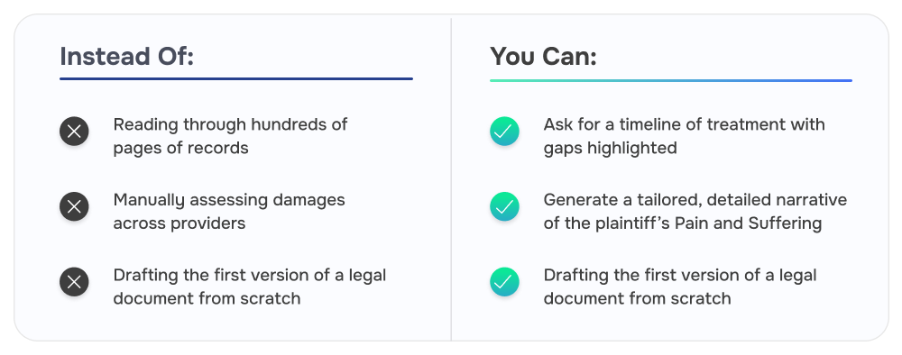 Legal work is full of high-value thinking, but also repetitive tasks: summarizing medical records, cleaning up notes, reformatting documents, and chasing down client treatment details.