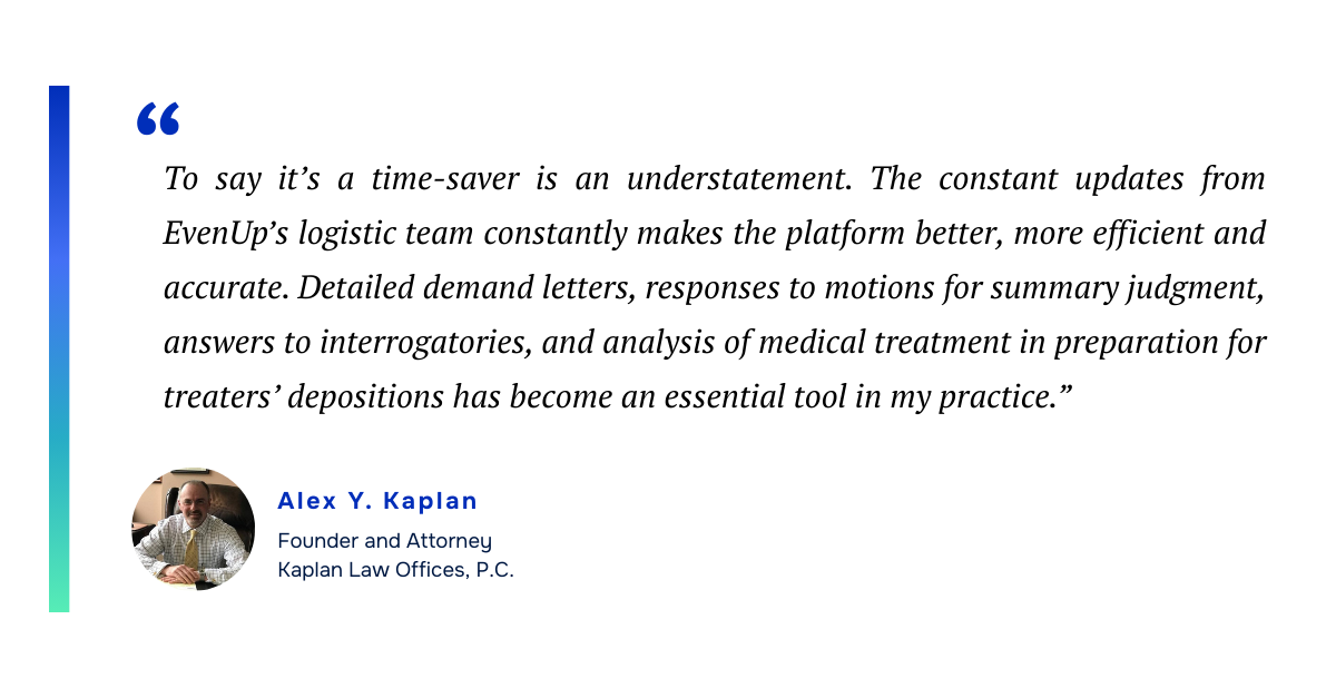 To say it’s a time-saver is an understatement. Constant updates from EvenUp makes the platform better, more efficient and accurate. Detailed demand letters, responses to motions, answers to interrogatories, and analysis of medical treatment have become an essential tool in my practice.”
