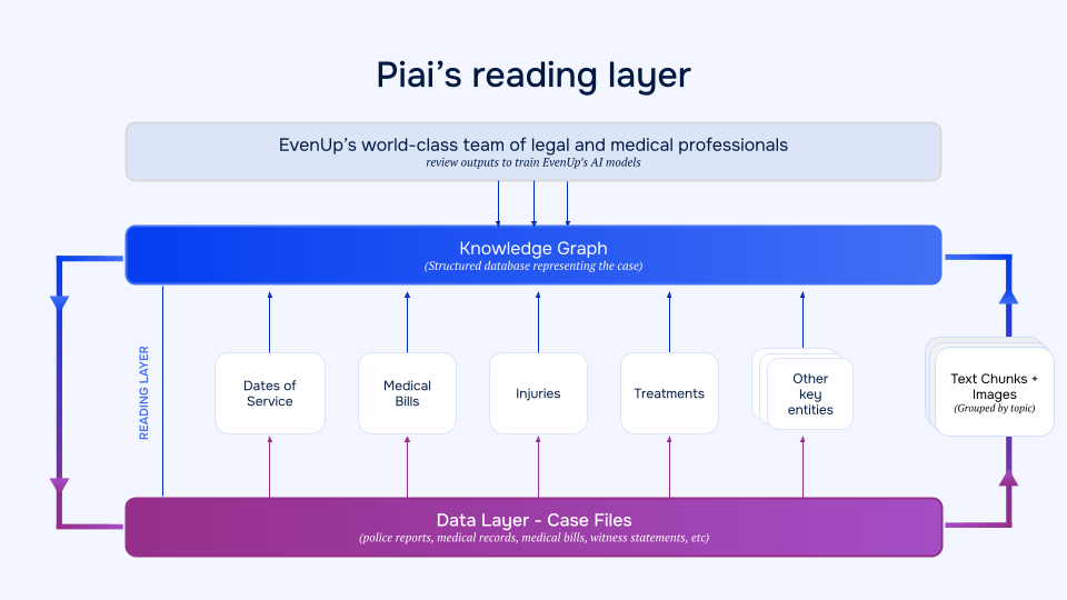 With this two-layer approach, Piai™ operates directly on your raw records—not on extracted summaries like other general-purpose AI tools do. That means the EvenUp platform understands how your firm operates—how you intake clients, how you work up a case, and how you manage treatment documentation—as well as how to generate accurate and secure documents and answers to questions.