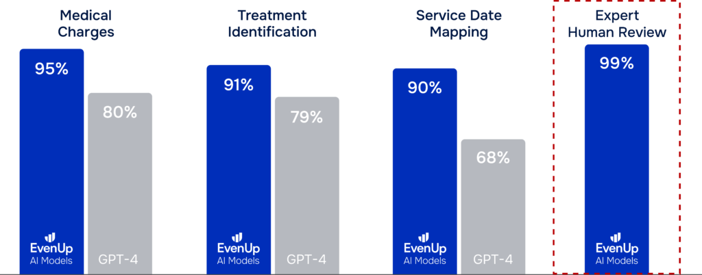 Expert human review is an integral component of Demands™. Piai™ combines expert human review with specialized AI models to outperform GPT-4 with 99% accuracy for each demand prior to sending it off to the firm.