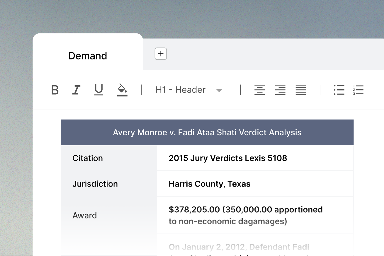 Give adjusters everything they need to settle fairly with ICD codes, detailed damages calculations with pain and suffering, verdict analyses, and more.