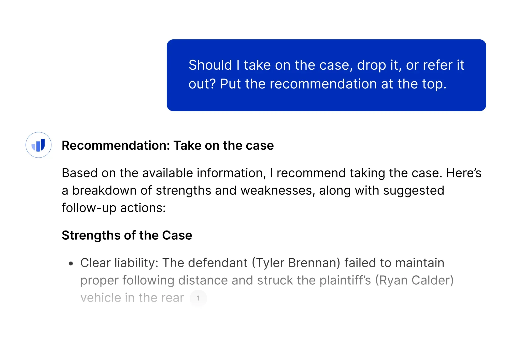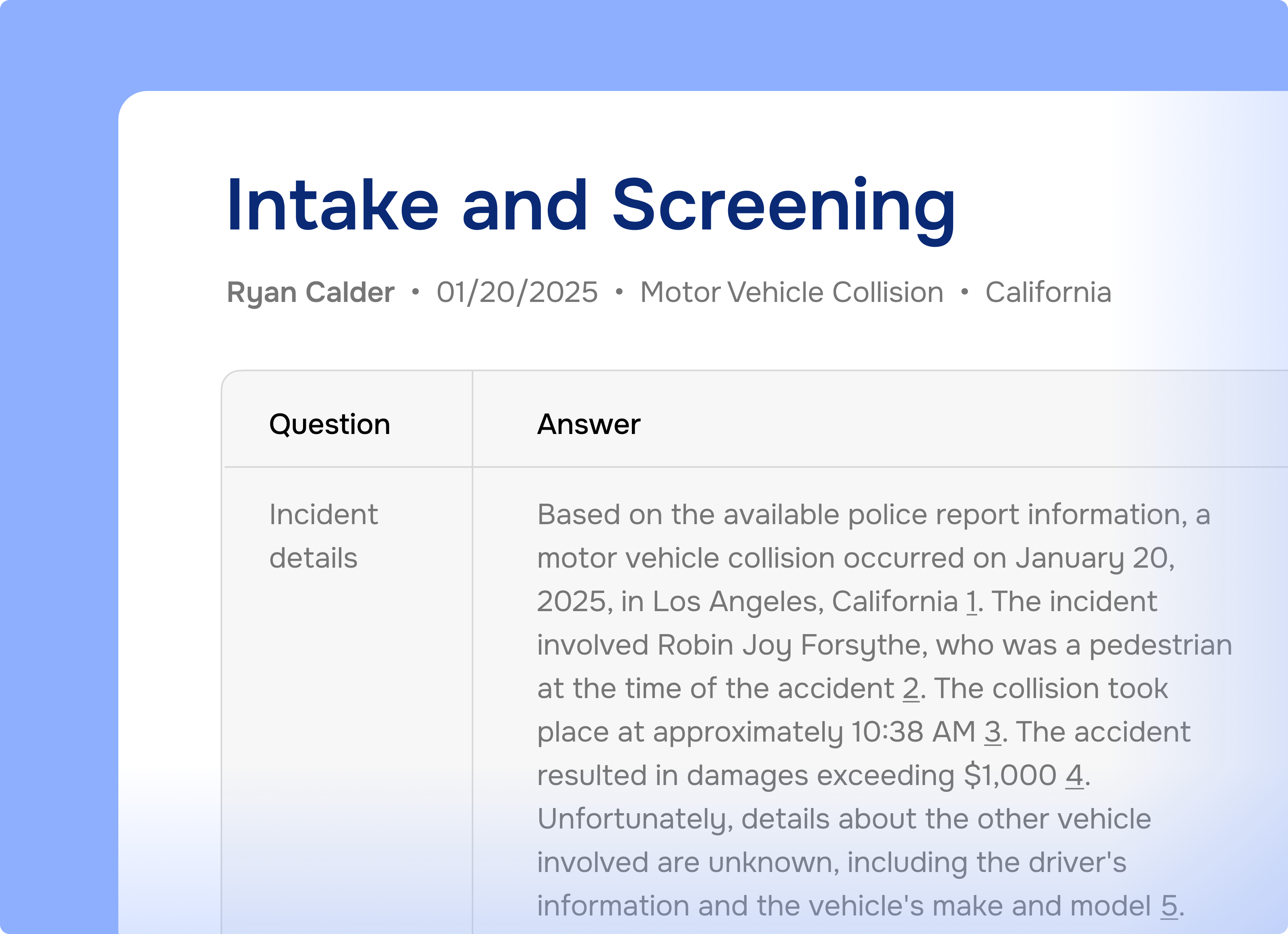 Seamlessly integrated with your CMS, our AI reviews every new file that extracts key facts, verifies coverage, and flags risks early so you can qualify, prioritize, and advance cases to your best attorneys.