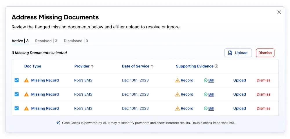 Similar to Case Strengths and Weaknesses, Missing Docs Check is another pre-built tool. It provides an easily repeatable process for identifying missing medical bills and records directly from raw documents before a demand is written.
