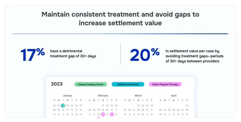 Our 2025 Breaking the Benchmarks report shows that maintaining consistent treatment and avoiding gaps can increase settlement value by 20% per case.