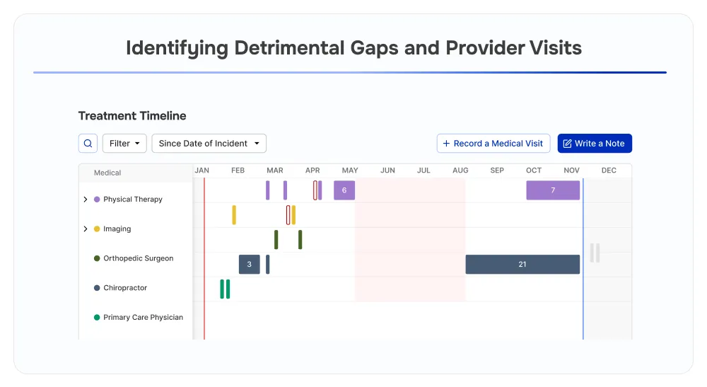 Rather than requiring specific prompts, EvenUp has standardized a Treatment Timelines feature that showcases a plaintiff’s medical journey; putting specific emphasis on any gaps in treatment of more than 30 days as these gaps are a main point of adjuster challenges.